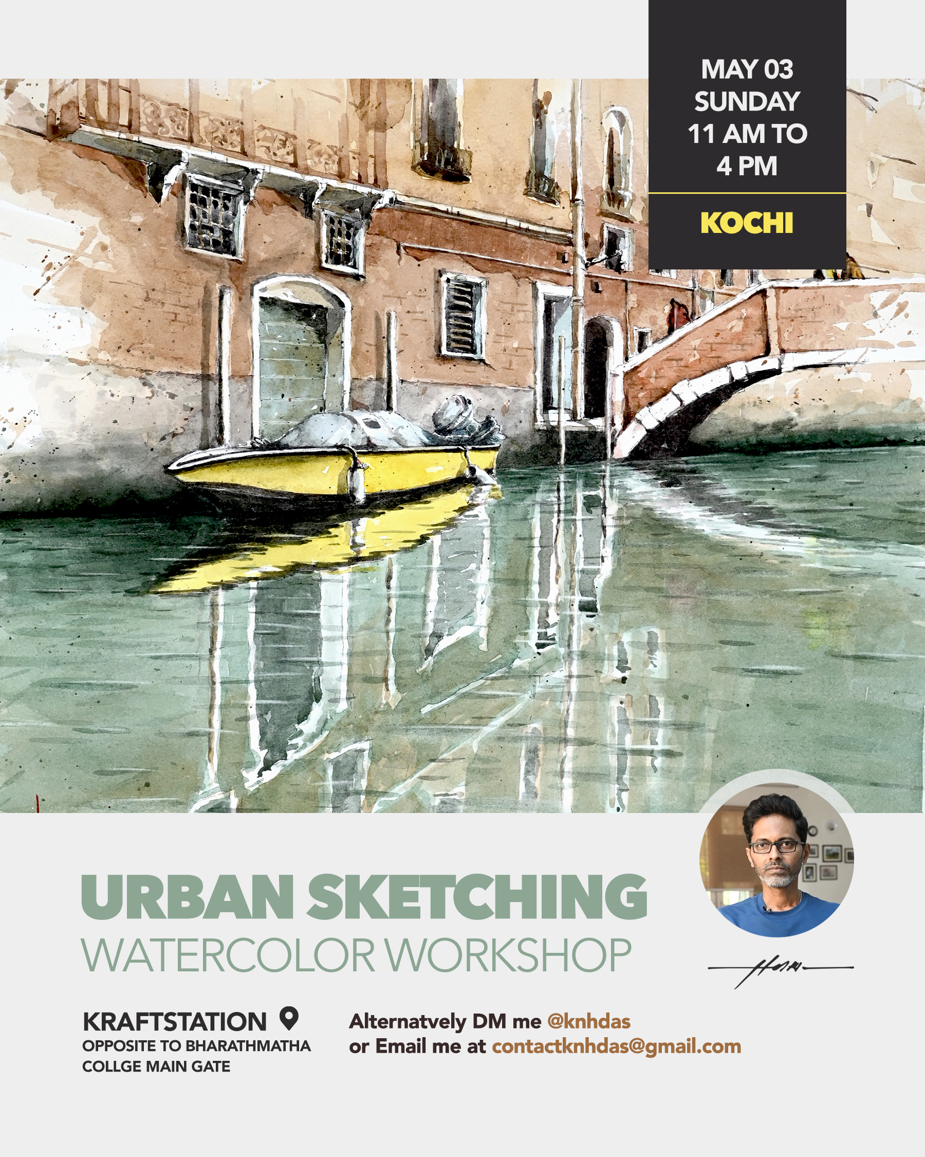 Watercolor Workshop by K N Hari Das Date: 03-May-2026 Time: 11 Am – 4 PM (1-2 pm lunch break) Venue: Kraftstation, 1st Floor, opposite Bharat Matha College Main Gate, Seaport - Airport Rd, Thrikkakara, Kochi, Kerala 682021 Everyone gets personal guidance . It is a beginner friendly session. All materials will be provided to use during the workshop (Materials to be returned at the end of the session), you will carry your painting home. Paint – Renesanspolska / Holbein Paper – Arches Fee: Rs 2999 ( DM me @knhdas for discounts - Early birds, Students, Attented my session before) This site supports UPI payments, however, please message @knhdas if you prefer registration by direct Gpay. The sessions are thoughtfully structured to provide clarity, depth, and practical understanding. 1.Overview & Foundational Approach An introduction to Hari’s approach to urban watercolor painting including: a.Understanding perspective in a simple, practical way b.Working with light and shadow to create depth c.Suggesting texture without overworking Using confident, expressive brush strokes 2.Demonstration Session Detailed live demonstration of sketching and painting, with participants welcome to ask questions throughout. The process will be explained step by step β€” from observation and composition to final washes. 3.Guided Practice Participants will sketch and paint their own work with close guidance from Hari. Individual attention is given throughout, helping each artist strengthen structure, clarity, and confidence.